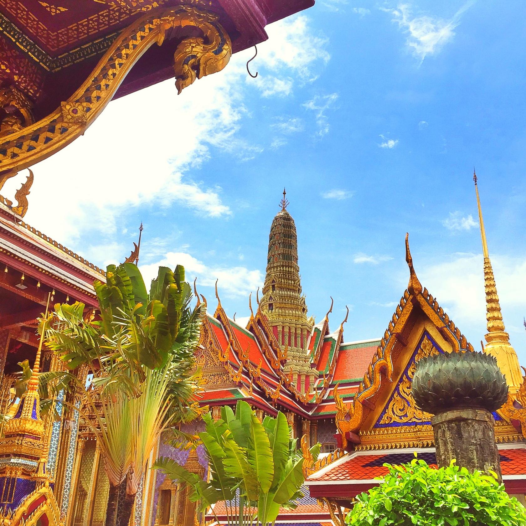 大皇宫(The Grand Palace)-坐落于湄南河东岸,是曼谷乃至泰国的地标。始建于1782年,经历代国王的不断修缮扩建,至今仍然金碧辉煌。这里汇聚了泰国建筑、绘画、雕刻和装潢艺术的精粹。节基王朝从一世到八世都住在此地,当时这里也是政府机构的办公之处,如今的九世皇即位后搬至新王宫居住。