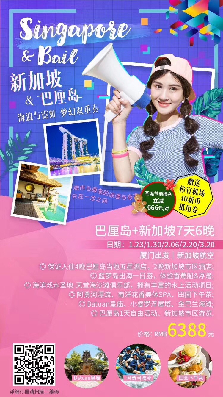【小婆罗浮屠塔】(约1小时)这是座拥有十年历史的人民纪念馆兼博物馆,是当地重要的博物馆和景观建筑,也被大家亲切地称为“小糊里糊涂塔”。一下车就能亲眼目睹它的建筑外观雄伟,跟随导游依次进入参观“立体逼真&缩小模型”之“巴厘岛历史场景”数十个,当年的巴厘岛与荷兰军队或日军作战现场模拟,其人物神态或烟火制作皆叹为观止…还可沿着旋转楼梯爬到顶楼俯瞰巴厘市景。前往巴厘岛机场抵达新加坡樟宜国际机场。抵达后前往【市政广场】欣赏高等法院、莱佛士酒店、国会大厦、圣安德烈教堂等西方殖民时期建筑,游览【鱼尾狮公园】,【滨海艺术中心】(外观),听导游徐徐道来新加坡如何从一个鱼港“淡马锡”摇身成为花园狮城的传奇故事。【克拉码头】,这一带酒吧林立,曾获选为新加坡十大浪漫景点之一,沿着河畔小酒吧和露天餐馆比比皆是,除了各国游人的身影,还有街头艺人的杂耍、小贩的吆喝、阵阵飘香的美食排挡。在摇曳的灯光中,感受着新加坡河两岸的异国风情和旖旎风光。