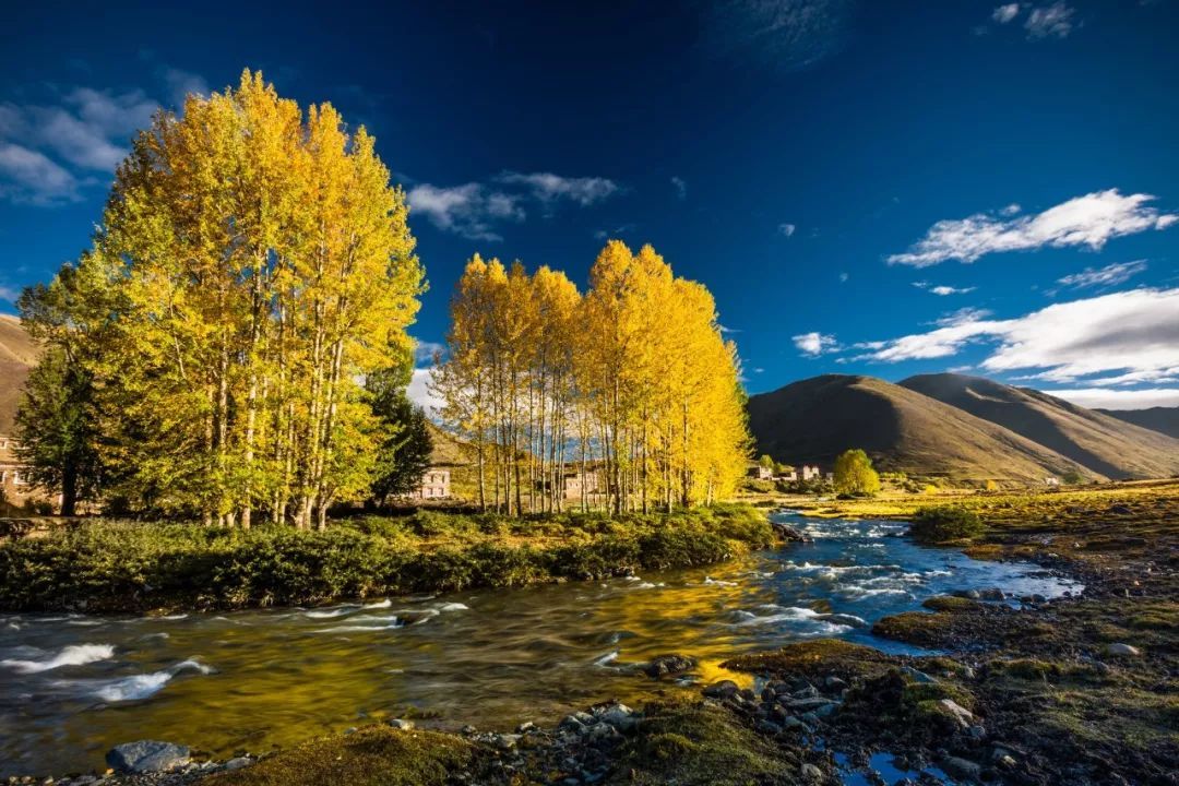 弯的小溪,金黄的柏杨,山峦连绵起伏,藏寨散落其间,牛羊安详地吃草……川西的平原风光美丽地绽这,