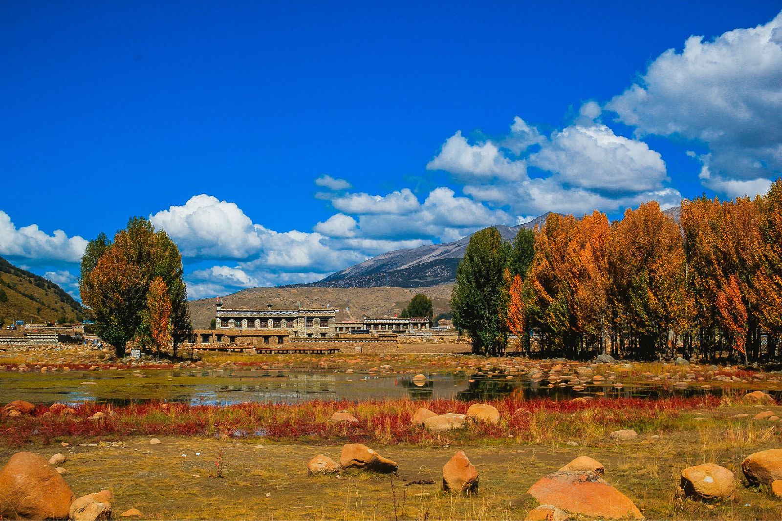 红草地:位于四川省甘孜州稻城县,极目远望,一片红彤彤的景致映入我的眼帘,红得那么热烈,那么艳丽,也那么醉人。在或黄或绿的白杨树的衬托下,灿灿生辉,妩媚无比。近视,"山青心欲燃,红树醉秋色",我们徜徉在公路畔的小村庄,"红草地"在阳光下奏鸣着令人陶醉的红色旋律,真想套用唐代诗人杜牧的千古名句,也喊出一句"停车坐爱红草地,霜叶红草十月花